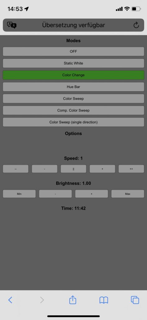 The corner lamp can be controlled from the local (WiFi) network using a web-browser. By navigating to the Arduinos IP-Address, an interface is provided to switch between the different light modes. Depending on the selected mode, different Options can be enabled/disabled, like color-fading, changes to random color generation,…