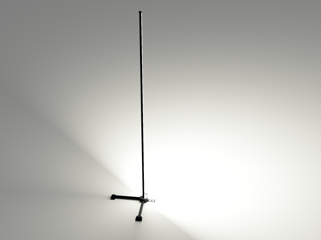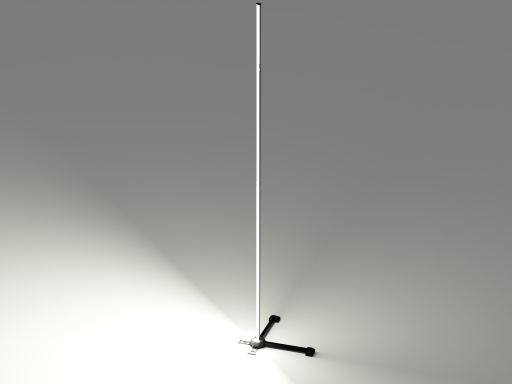 The vertical light element is 200cm tall, fitting into the living room corner. The aluminium feet are approximately 50cm in lenght, giving a solid foundation. The lamp itself has (optional) spacers, to keep it at a distance of about 10cm from the wall for a nice effect with indirect lighting.