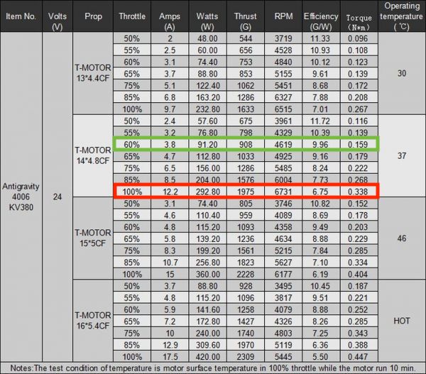 Marked in green is the motors running at 60% throttle and providing about 908g of thrust each. This will be referenced as Burst Power henceforth.