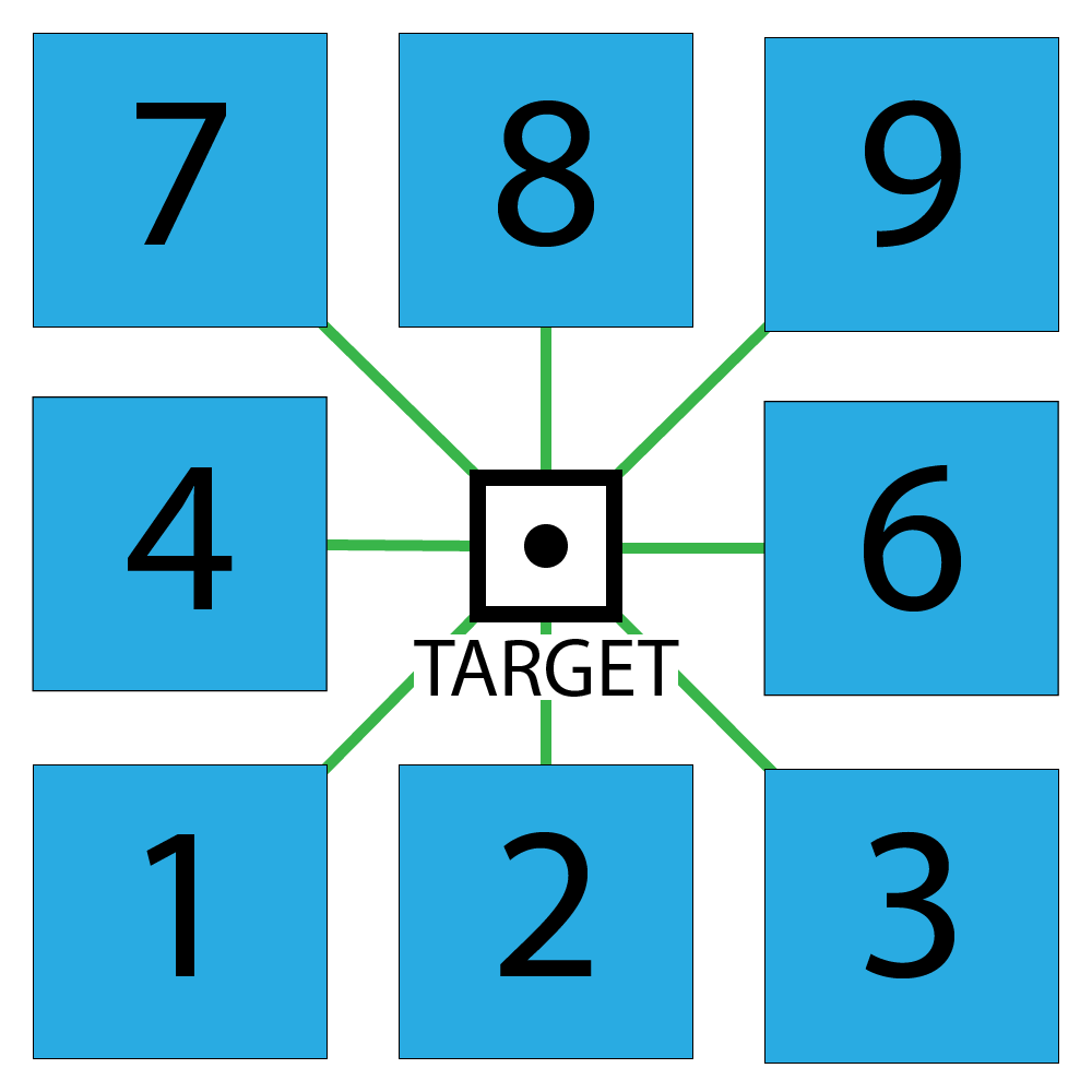 The target is assumed to be at the position of the “5” and the Data Block position is according to the keys surrounding the “5”: